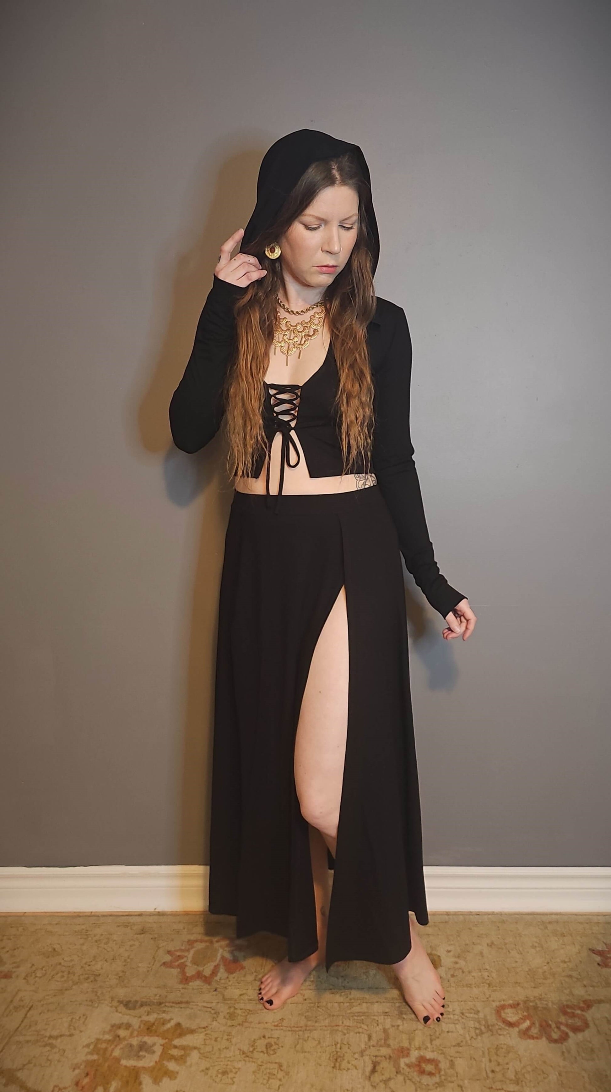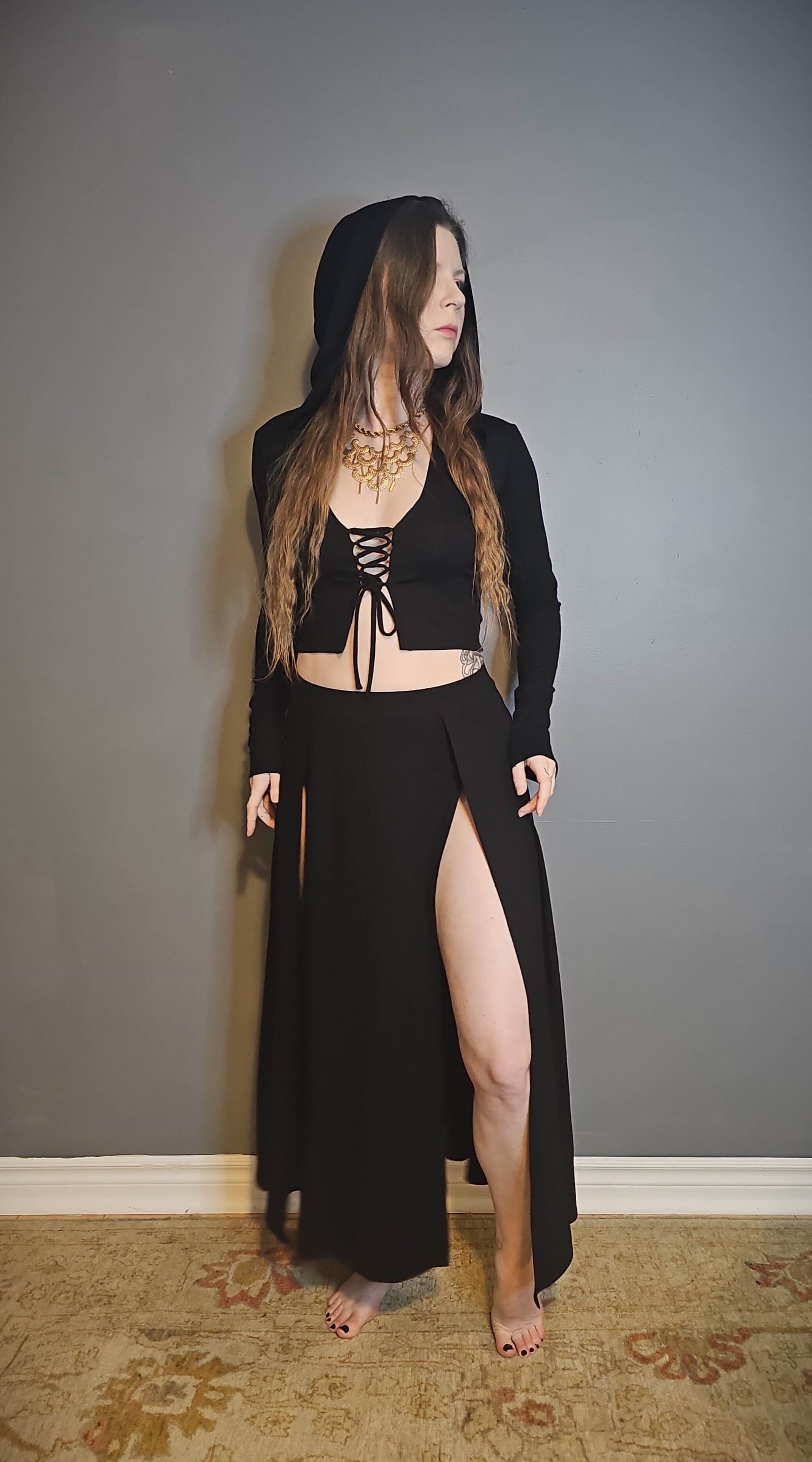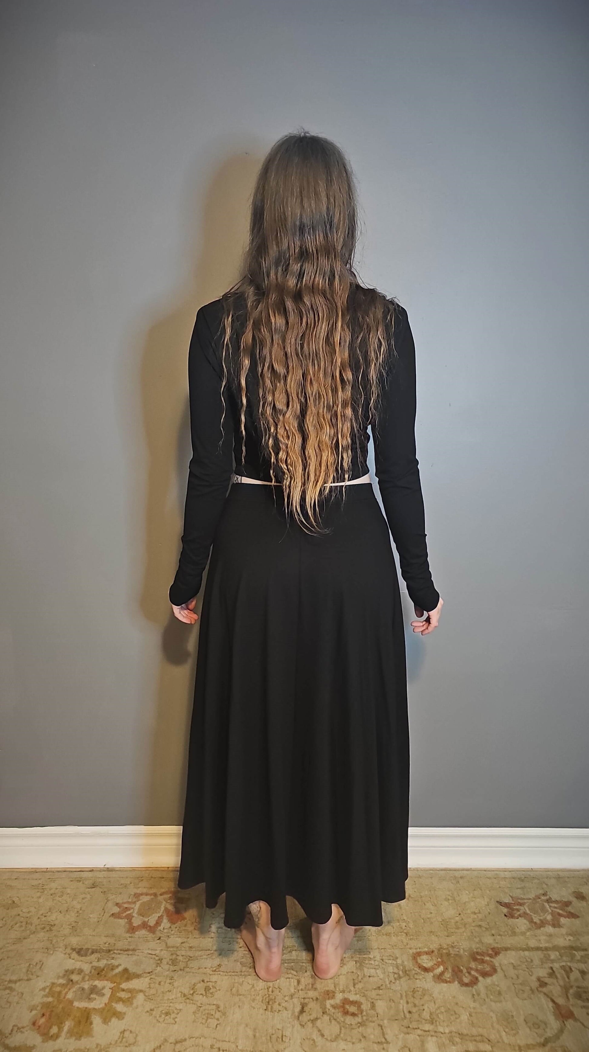 The skirt is made from a soft, black, jersey knit and an elastic waist band. Featuring an a line skirt shape with a separate front panel that over laps with slits down either side. Having an elastic waist band and knit fabric it can be worn around the waist or lower on the hip.