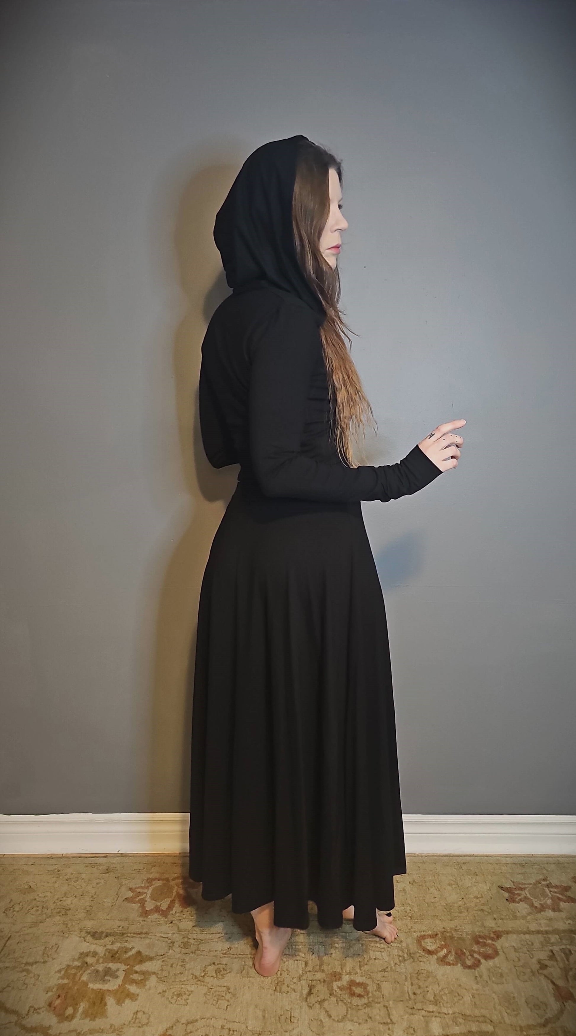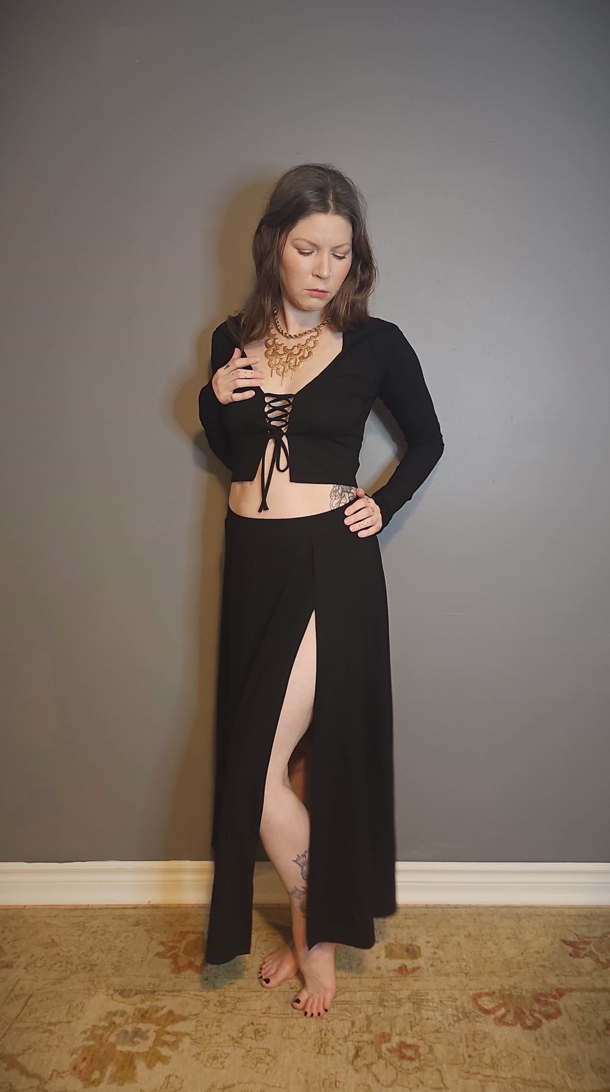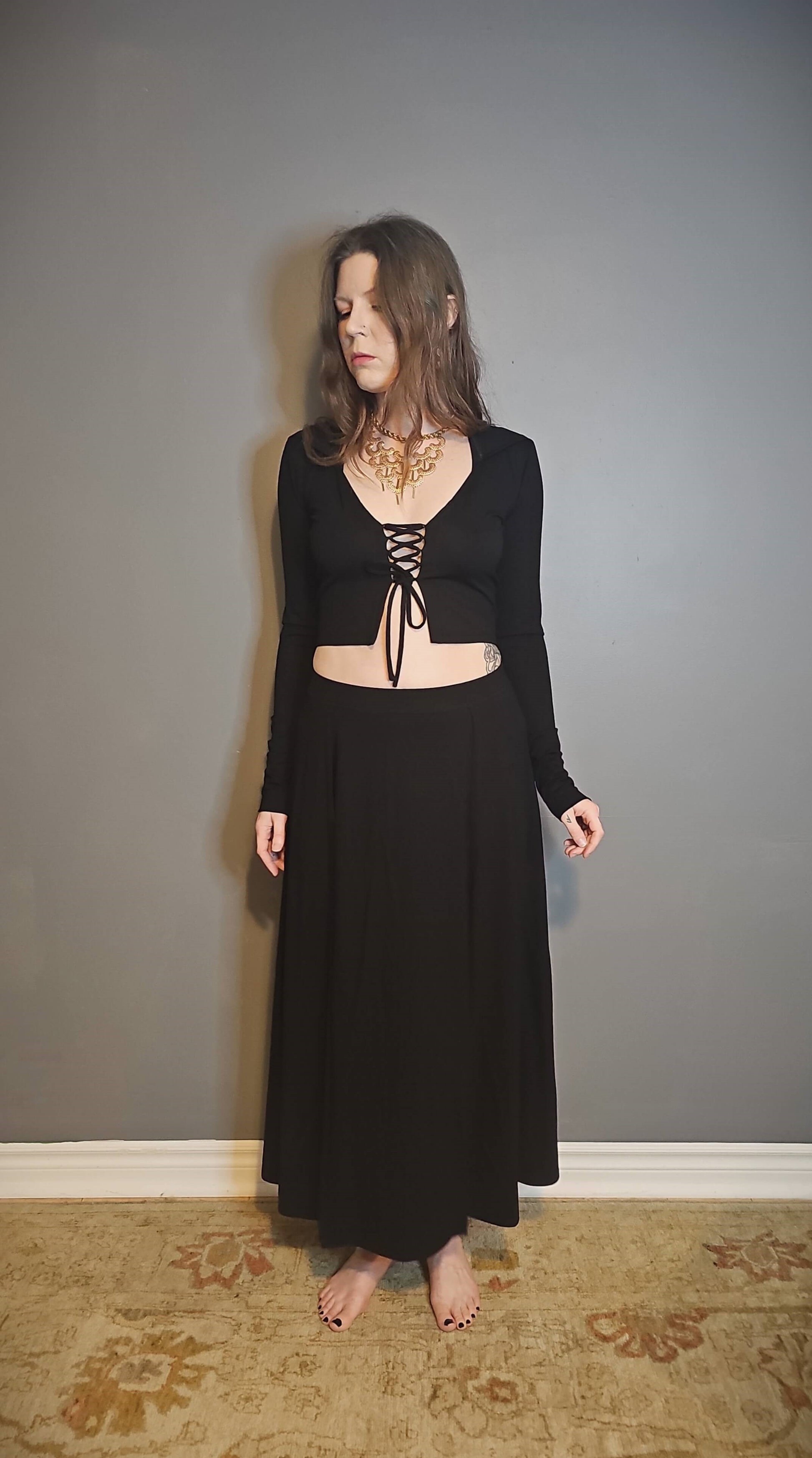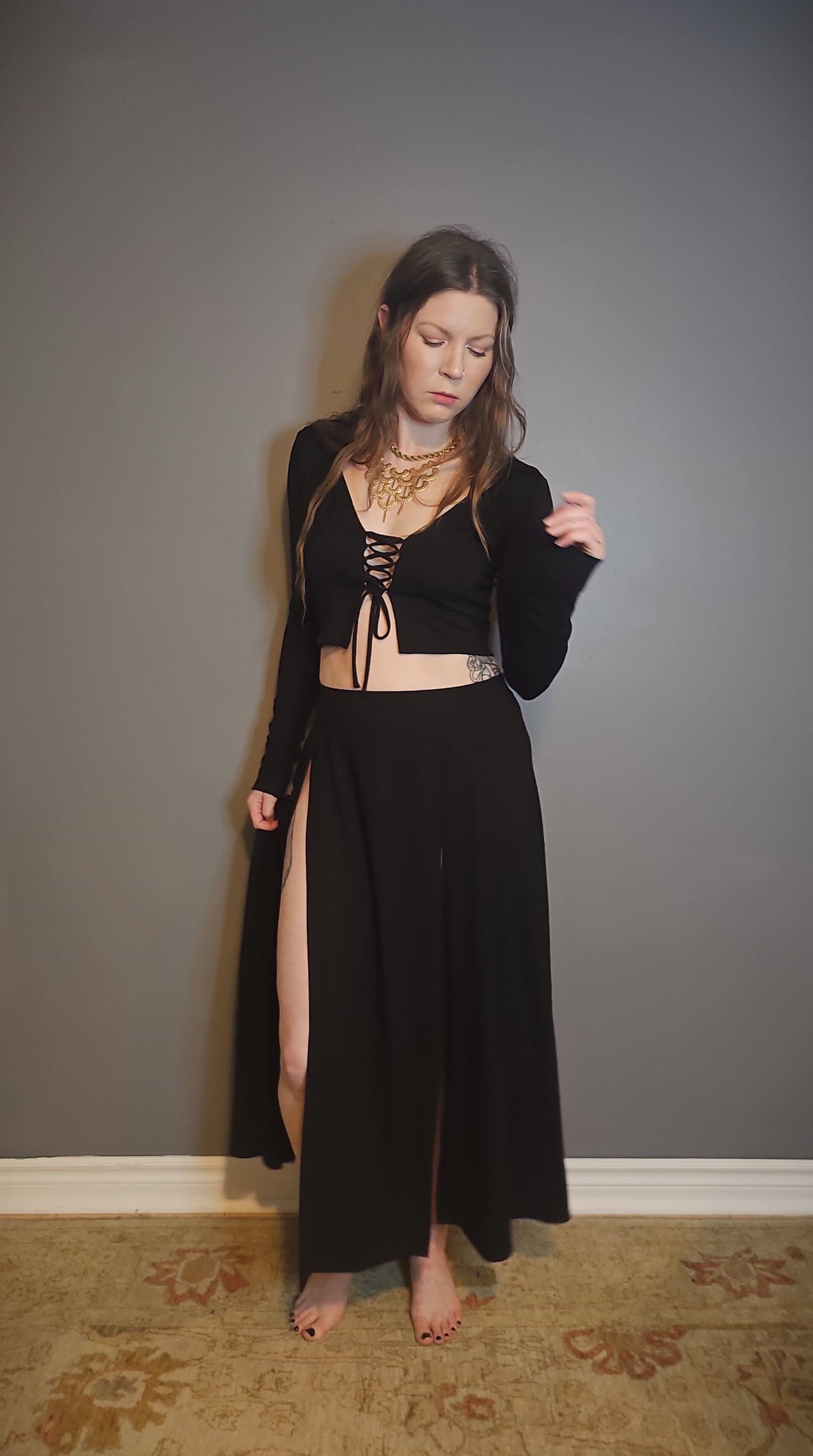 The skirt is made from a soft, black, jersey knit and an elastic waist band. Featuring an a line skirt shape with a separate front panel that over laps with slits down either side. Having an elastic waist band and knit fabric it can be worn around the waist or lower on the hip.